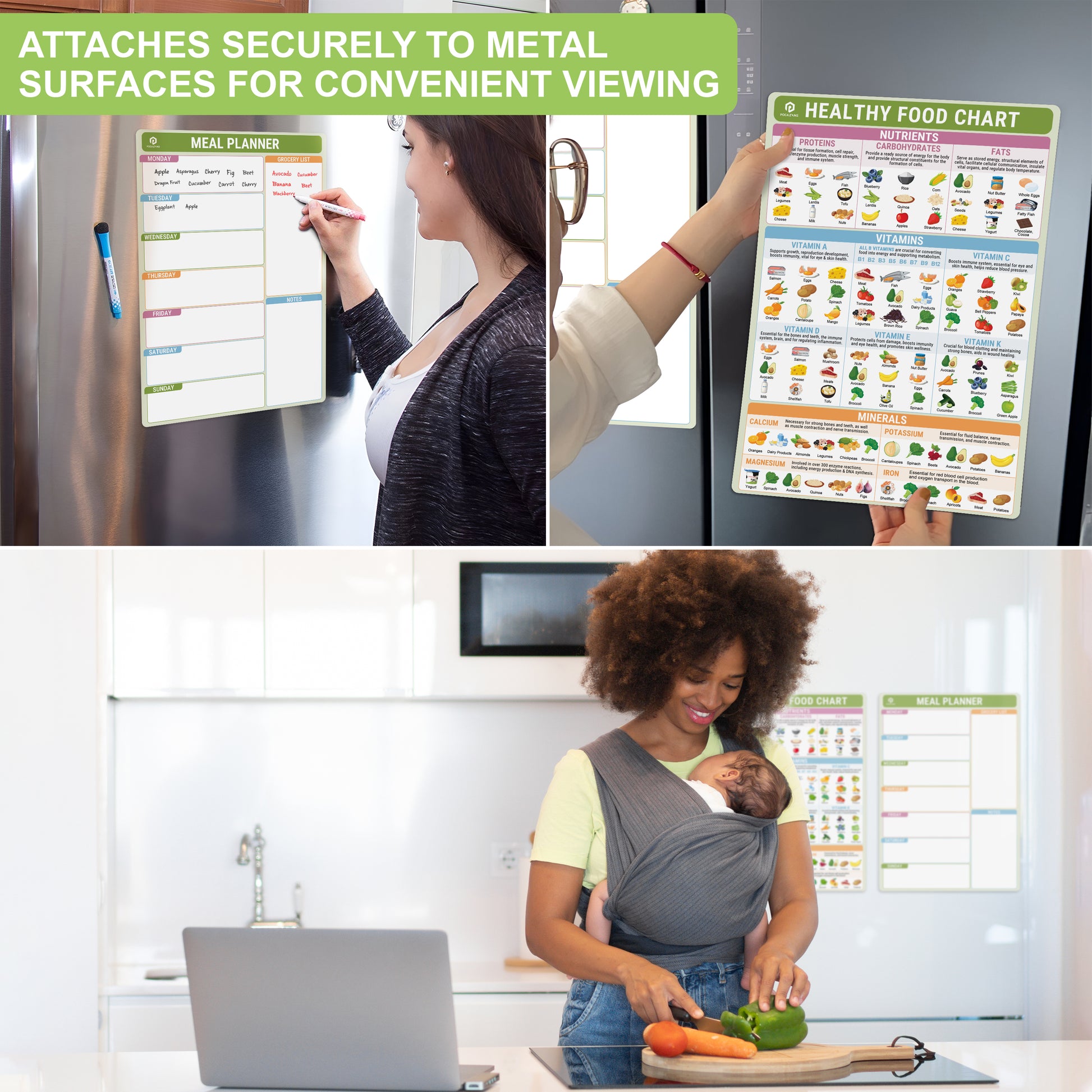 Set of 2 Healthy Food Chart Magnet (10"x14") Magnetic Dry Erase Fridge Chart, Vitamin Chart for Healthy Eating, Nutrition Posters, Kitchen Conversion Chart, Meal Planner Diet, 3 Markers + Eraser